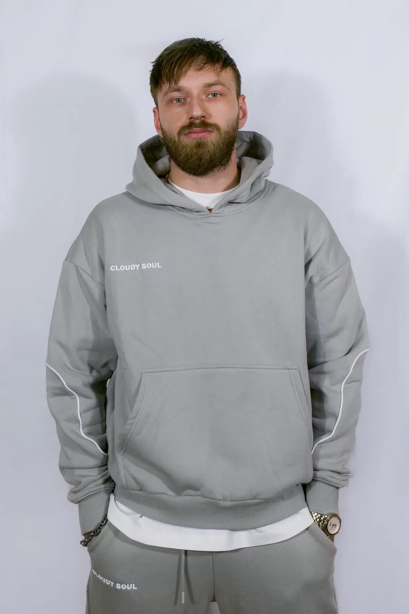 Des lignes blanches parcourent les manches et reprennent une partie du logo Cloudy Soul, créant un détail graphique subtil et reconnaissable.